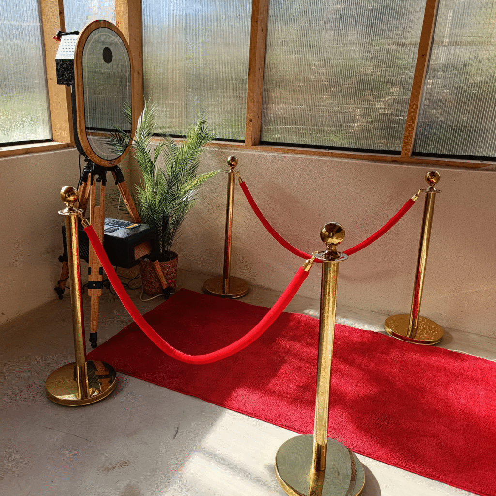 Impossible de passer à côté : la borne miroir Mirrozh étant bien mise en évidence, installée dans un décor VIP : tapis rouge, potelets dorés, plantes vertes et cadre photo personnalisé aux couleurs de l’événement.